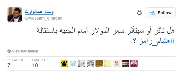 وتساءل وسام عبد الوارث، مؤسس ائتلاف صوت الحكمة: “هل تأثر أو سيتأثر سعر الدولار أمام الجنيه باستقالة #هشام_رامز؟”.