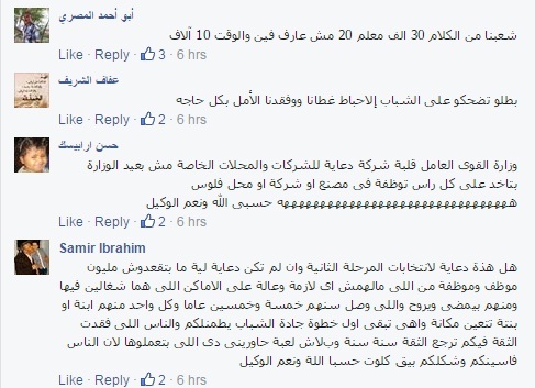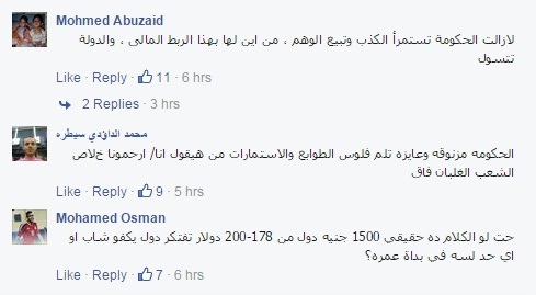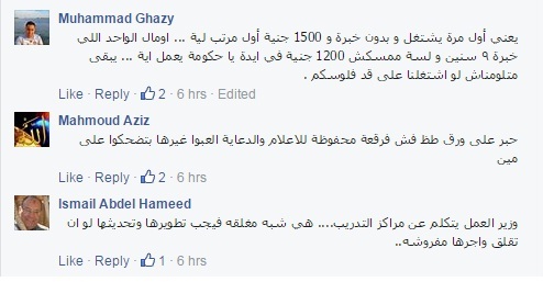 وجاء أغلب تعليقات رواد موقع “فيس بوك” مكذبة تلك التصريحات، معتبرة أنها خدعة جديدة من الحكومة للشباب.