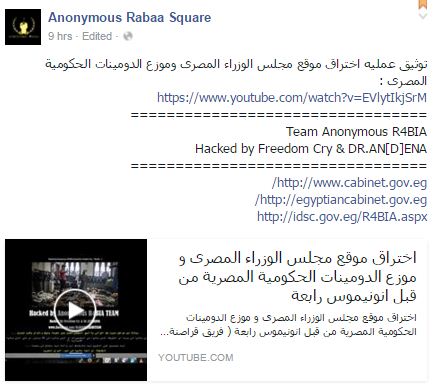ونشرت “أنونيموس رابعة”، فيديو عبر موقع “يوتيوب”، يوضح عملية اختراق موقع مجلس الوزراء المصري وموزع الدومينات الحكومية المصرية”، مرفقين رسالة تهديد كان نصها: “لن يكون الموقع الأول أو الأخير وستتوالى ضرباتنا على المواقع الحكومية”.