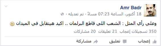 الناشط السياسي والصحفي، عمرو بدر، هو الآخر سخر من انتخابات مجلس النواب، قائلًا -على حسابه الشخصي في موقع التواصل الاجتماعي “فيس بوك”-: “على رأي المثل: الشعب اللي قاطع البرلمان، أكيد هيتقابل في الميدان”، في إشارة إلى مصير حالة الغضب المسيطرة على الشعب المصري، وفي مقدمه الشباب الذي كان مؤيدًا للسيسي.