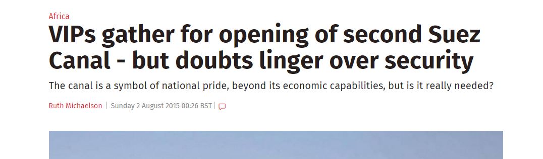 بتاريخ 2-8- 2015 نشرت صحيفة الإندبندنت البريطانية مقالا، بعنوان ” تجمع للشخصيات الهامة في حفل افتتاح القناة الثانية ولكن تبقى شكوك حول الأمن ” ووضعت الصحيفة عنوانا فرعياً “القناة مصدر للفخر الوطني لكن هل هناك حاجة لها؟”
