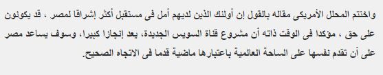 و ختم الكاتب بالقول “هؤلاء الذين يأملون في مستقبل أفضل لمصر ربما يكونوا على صواب، فإنجاز قناة السويس سوف يساعد على تقديم مصر لنفسها على المسرح الدولي إذ تتجه البلاد إلى الإتجاه الصحيح لكن يجب ألا يتم نسيان أن الإستقرار هش”.