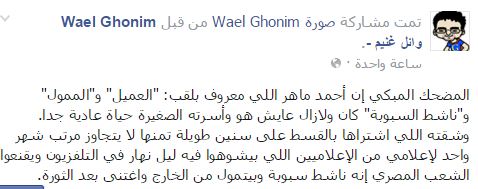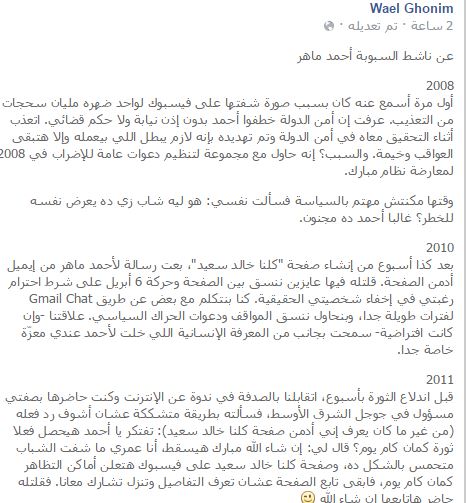 وكتب “غنيم” -في منشور آخر- عن ذكريات تعرفه على أحمد ماهر منذ عام 2008: “ماهر” كان يتعرض للتعذيب نتيجة دعوته لتنظيم إضراب ضد نظام مبارك في ذلك الوقت.