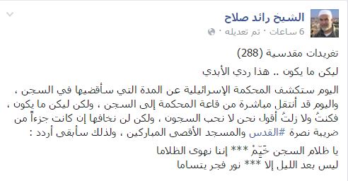 وكتب الشيخ صلاح: “ليكن ما يكون.. هذا ردي الأبدي (..) اليوم قد انتقل مباشرة من قاعة المحكمة إلى السجن، ولكن ليكن ما يكون”.