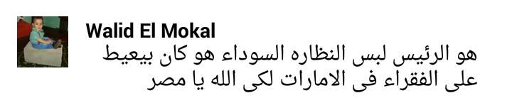 كما قال وليد الموكل: “هو الرئيس لبس النظارة السوداء هو كان بيعيط على الفقراء في الإمارات لكِ الله يا مصر”.
