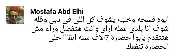وعلى جانب آخر، قال مصطفى عبد الحي: “أيوة فسحة وخليه يشوف كل اللي في دبي، وقول له شوف أنا بلدي عاملة إزاي وإنت هتفضل وراء مش هتتقدم يأبو حضارة”.