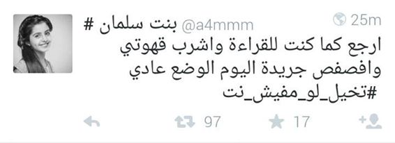 ونستعرض في هذا التقرير عددا من تعليقات رواد “تويتر” على هذا الهاشتاج، قالت بنت سلمان: “أرجع كما كنت للقراءة وأشرب قهوتي وأفصفص جريدة اليوم الوضع عادي”.