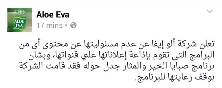 ونشرت الشركة بيانا على صفحتها الرسمية بموقع التواصل الاجتماعي “فيس بوك” قائلة: “تعلن شركة ألو إيفا عن عدم مسؤوليتها عن محتوى أي من البرامج التي تقوم بإذاعة إعلانتها على قنواتها وبشأن برنامج “صبايا الخير” والمثار جدل حوله فقد قامت الشركة بوقف رعايتها للبرنامج”.