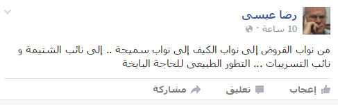 كما سخر الخبير الاقتصادي، رضا عيسى، قائلا: “من نواب القروض إلى نواب الكيف إلى نواب سميحة.. إلى نائب الشتيمة ونائب التسريبات.. التطور الطبيعي للحاجة البايخة”.