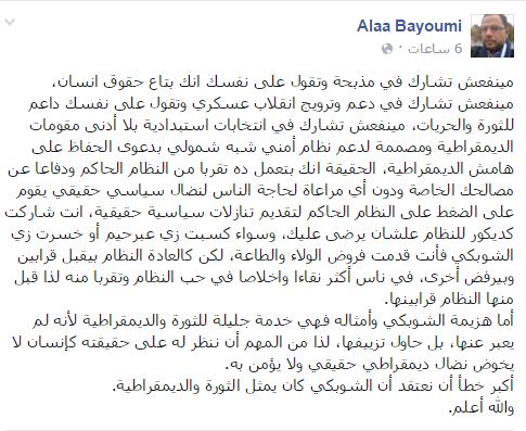 وأضاف: “الحقيقة إنك بتعمل ده تقربا من النظام الحاكم ودفاعا عن مصالحك الخاصة، ودون أي مراعاة لحاجة الناس لنضال سياسي حقيقي يقوم على الضغط على النظام الحاكم لتقديم تنازلات سياسية حقيقية، وسواء كسبت زي عبرحيم أو خسرت زي الشوبكي فأنت قدمت فروض الولاء والطاعة، لكن كالعادة النظام بيقبل قرابين وبيرفض أخرى، في ناس أكثر نقاء وإخلاصا في حب النظام وتقربا منه لذا قبل منها النظام قرابينها”.