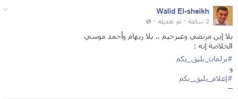 وقال الكاتب الصحفي، وليد الشيخ: “بلا ابن مرتضى وعبرحيم.. بلا ريهام وأحمد موسى الخلاصة إنه برلمان يليق بكم، وإعلام يليق بكم”.