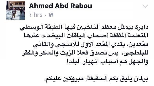 وعن دائرة الدقي والتي فاز فيها كل من على عبد الرحيم ونجل مرتضى منصور، قال أحمد عبد ربه، أستاذ العلوم السياسية: “دايرة بيمثل معظم الناخبين فيها الطبقة الوسطى المتعلمة المثقفة أصحاب الياقات البيضاء، عندها مقعدين، بتدي المقعد الأول للأمنجي والتاني للبلطجي، بس تصدق فعلا الزيت والسكر والفقر والجهل هم أسباب انهيار البلد! برلمان يليق بكم الحقيقة، مبروكين عليكم”.