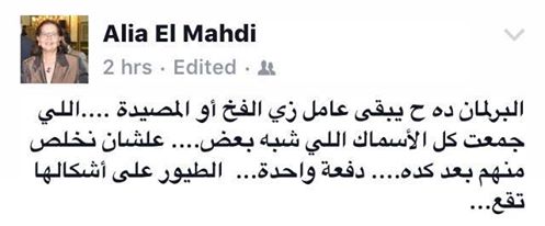 وعلقت عالية المهدي، أستاذ العلوم السياسية، قائلة: “البرلمان ده هيبقى عامل زي الفخ أو المصيدة.. اللي جمعت كل الأسماك اللي شبه بعض.. علشان نخلص منهم بعد كده دفعة واحدة.. الطيور على أشكالها تقع”.