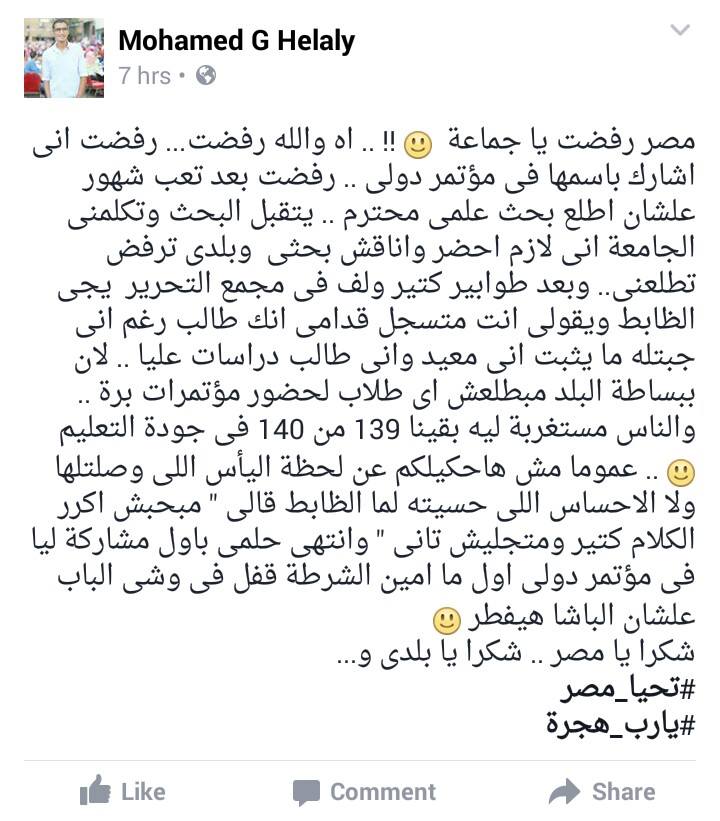 وقال هلالي في تعليق له على موقع التواصل الاجتماعي “فيس بوك”: “رفضت يا جماعة.. أه والله رفضت.. رفضت إني أشارك باسمها في مؤتمر دولي.. رفضت بعد تعب شهور عشان أطلع بحث علمي محترم.. يتقبل البحث وتكلمني الجامعة إني لازم أحضر وأناقش بحثي وبلدي ترفض تطلعني.. وبعد طوابير ولف في مجمع التحرير ييجي الضابط ويقول لي إنت متسجل قدامي إنك طالب رغم إني جبت له ما يثبت إني معيد وإني طالب دراسات عليا، لأن ببساطة البلد مابطلعش أي طلاب لحضور مؤتمر بره.. والناس مستغربة ليه بقينا 139 من 140 في جودة التعليم.. عموما مش هاحكي لكم عن لحظة اليأس اللي وصلت لها ولا الإحساس اللي حسيته لما الضابط قال لي “مابحبش أكرر الكلام كتير وماتجليش تاني”، وانتهى حلمي بأول مشاركة ليّ في مؤتمر دولي أول ما أمين الشرطة قفل في وشي الباب علشان الباشا هيفطر.. شكرا يا مصر.. شكرا يا بلدي، و#تحيا_مصر، #يا رب_ هجرة”.
