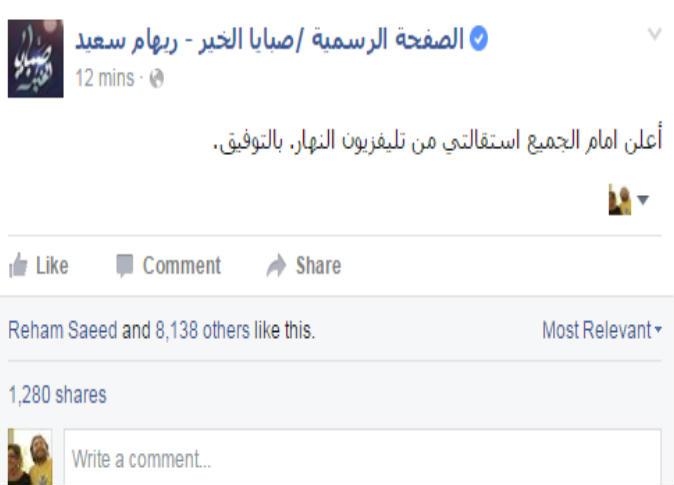 أعلنت الإعلامية ريهام سعيد مقدمة برنامج “صبايا الخبر” على قناة النهار استقالتها من القناة بعد واقعة “فتاة المول”
