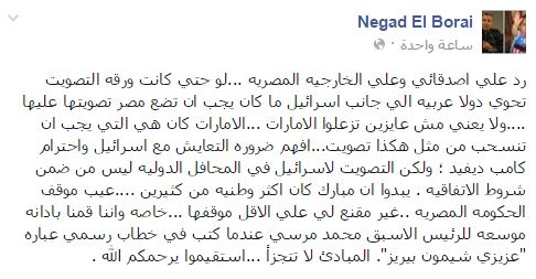 وقال -عبر منشور له على “فيس بوك”-: “لو حتى كانت ورقة التصويت تحوي دولًا عربية إلى جانب إسرائيل ما كان يجب أن تضع مصر تصويتها عليها”.