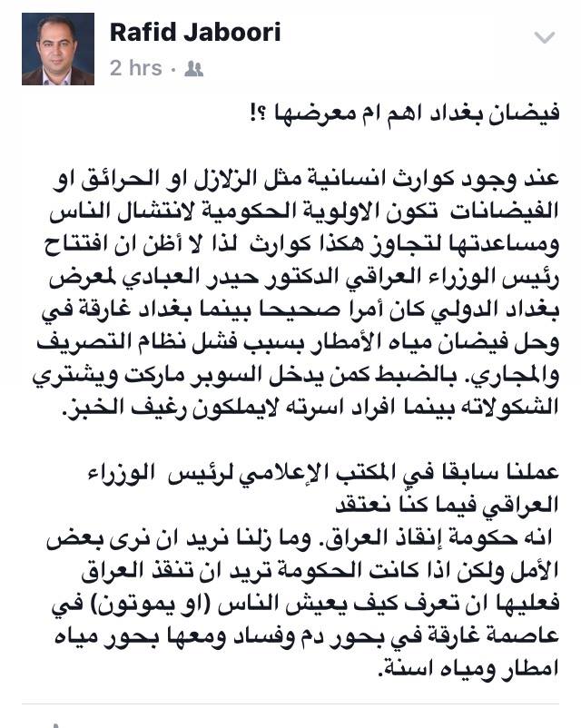 وأضاف الجبوري في تدوينة له عبر حسابه الشخصي على موقع التواصل الاجتماعي “فيس بوك”، “لا أظن أن افتتاح رئيس الوزراء العراقي حيدر العبادي لمعرض بغداد الدولي كان أمرًا صحيحًا، بينما بغداد غارقة في وحل فيضان مياه الأمطار بسبب فشل نظام الصرف والمجاري”.