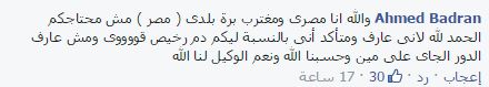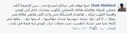وقال Ehab Abdelaal: “خدوا موقف في حياتكم لمرة واحدة.. بس الحقيقة أنكم ممثلين للدولة علاقتكم هائلة بالممثلين للكويت وعشان خاطر أمن قومي واهمية الكويت ليكم.. هاتعدي المشكلة مش واحد اللي هايغير علاقة مصر بدولة.. لا في دول بتحرك جيوشها عشان مواطنيها.. اسمها دول.. بطلوا بقى كلمة تحيا مصر عشان ادهست تحت عجلات شاب كويتي ليه قيمه في بلده”.