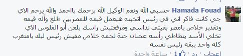 وترحم Hamada Fouad على وفاة المواطن المصري، نادمًا على انتخاب السيسي، قائلًا: “حسبي الله ونعم الوكيل الله يرحمك يا أحمد، كنت فاكر إن في رئيس انتخبته هيعمل قيمة، خلاص يامصر بقيتي تداسي ومرفعتيش راسك يلعن أبو الفلوس اللي تخلي الأسد يتطاطي رأسه عشان حتة لحمة خلاص مفيش رئيس ليك يامتغرب كله واحد يبقى رئيس نفسه”.