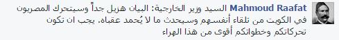 ووصف Mahmoud Raafat البيان بـ”الهزيل”، محذرًا من غضبة المصريين بالكويت، قائلًا: “السيد وزير الخارجية: البيان هزيل جدًا وسيتحرك المصريون في الكويت من تلقاء أنفسهم وسيحدث ما لا يُحمد عقباه. يجب أن تكون تحركاتكم وخطواتكم أقوى من هذا الهراء”.