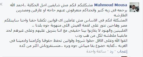 وهاجم Mahmoud Mousa الخارجية بقوله: “مشكلتكم إنكم مش شايفين أصل الحكاية.. احمد الله يرحمه فى زيه كتير واتحداكم متعرفوش عنهم حاجة أو عارفين ومصدرين الطارشة.. المشكلة إنكم في الأساس مش عاملين أي قوانين تكفلنا حقنا واحنا سايبين مصر وهاجين ندور على لقمة العيش اللي منهوبة جوه بلدنا. وأضاف “الفلبينيين والهنود لا يقارنوا بينا حقيقي مع إننا بنتريق عليهم وعلى غيرهم لحد مابقينا ملطشة لكل من هب ودب.. اتقوا الله وعلى الأقل حطوا شروط وقوانين تحفظ حقوقنا وكرامتنا وادميتنا فى الغربة ..كفاية خضوع بقا ميبقاش جوه وبره.. متستفزوناش أكتر من كده”.