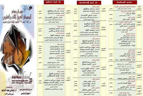 انطلقت فعاليات مهرجان الموسيقى العربية الدورة الـ23 أمس الأحد، والذي يستمر حتى الإثنين القادم 9 نوفمبر، على جميع مسارح الأوبرا المصرية بالقاهرة ودمنهور والإسكندرية، وذلك بمشاركة 74 مطربًا من 12 دولة خلال 39 حفلاً.