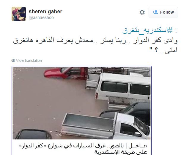 ونشرت sheren gaber صورة لكفر الدوار وهي غارقة قائلة: “وآدي كفر الدوار.. ربنا يستر.. محدش يعرف القاهرة هاتغرق إمتى..؟”.