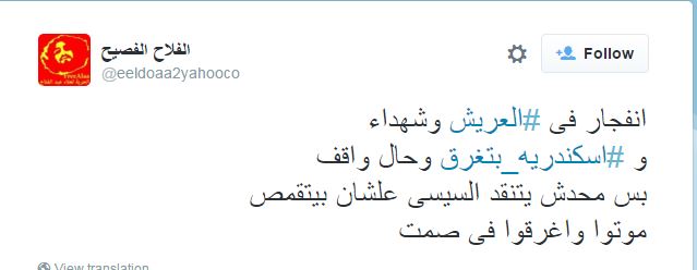 وقال الفلاح الفصيح: “انفجار في #العريش وشهداء و#إسكندرية_بتغرق وحال واقف.. بس محدش ينتقد السيسي علشان بيتقمص.. موتوا واغرقوا في صمت”.
