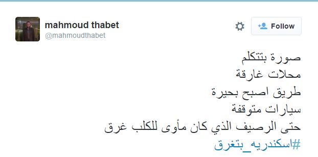 للمرة الثانية، يتصدر هاشتاج "إسكندرية بتغرق"، قائمة الأعلى تداولًا لدى موقع التواصل الاجتماعي "تويتر"؛ وذلك بعد غرق المحافظة للمرة الثانية خلال أيام.