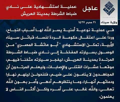 تبنى "ولاية سيناء"، التابع لتنظيم الدولة، عملية تفجير السيارة المفخخة، صباح اليوم الأربعاء، أمام نادي ضباط الشرطة بمدينة العريش، والتي راح ضحيتها 3 شرطيين، وإصابة 10 آخرين بينهم 5 مدنيين.