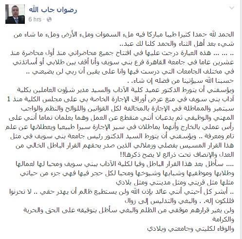 وعلق الدكتور رضوان جاب الله على القرار في منشور له عبر حسابه على موقع التواصل الاجتماعي “فيس بوك”، إذ عبر عن أسفه من تورط الدكتور عميد كلية الآداب ومدير شؤون العاملين بكلية آداب بني سويف في منع عرض أوراق الإجازة الخاصة به على مجلس الكلية منذ 1 سبتمبر، والمماطلة في الإجازة بالمخالفة لكل القوانين واللوائح والنظم والواجب المهني والوظيفي، وعبر عن أسفه من تورط السيد الدكتور رئيس جامعة بني سويف، في مثل هذا القرار المسيس بفصله وفصل زملائه، على حد قوله.