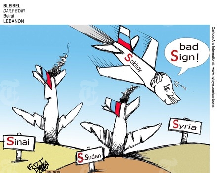 ونشر نفس الموقع أيضا هذا الرسم ساخرا من إعلان تنظيم الدولة مسؤوليته عن إسقاط الطائرة الروسية في سيناء: