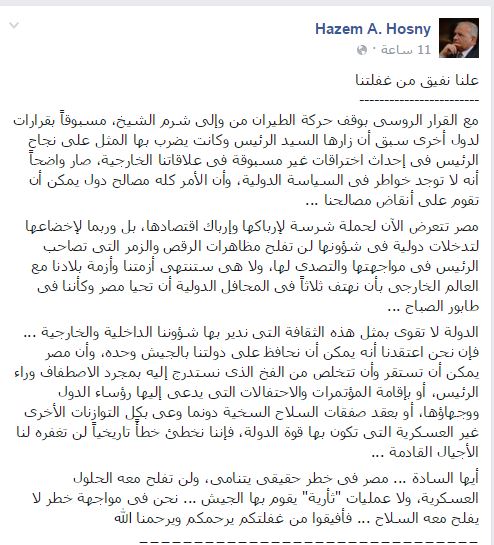 وأضاف “مع القرار الروسي بوقف حركة الطيران من وإلى شرم الشيخ، مسبوقًا بقرارات لدول أخرى سبق أن زارها السيد الرئيس -على حد وصفه- وكانت يضرب بها المثل على نجاح الرئيس في إحداث اختراقات غير مسبوقة في علاقاتنا الخارجية، صار واضحًا أنه لا توجد خواطر في السياسة الدولية، وأن الأمر كله مصالح دول يمكن أن تقوم على أنقاض مصالحنا”.
