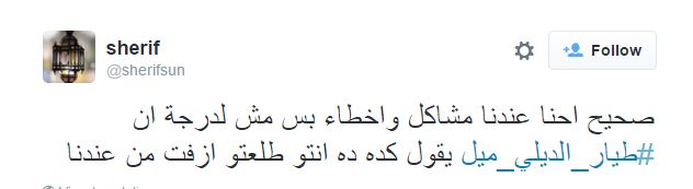 وقال sheriff“صحيح احنا عندنا مشاكل وأخطاء بس مش لدرجة ان  #طيار_الديلي_ميل يقول كده ده انتو طلعتو ازفت من عندنا”.