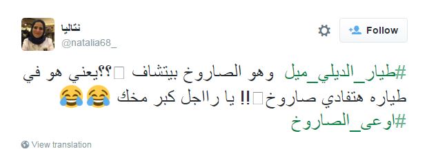 وعلقت نتاليا قائلة: “طيار_الديلي_ميل  وهو الصاروخ بيتشاف ؟؟يعني هو في طياره هتفادي صاروخ! يا رااجل كبر مخك #اوعى_الصاروخ”.