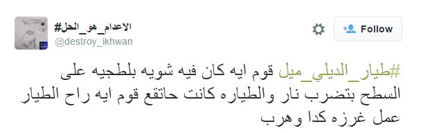 وسخر ‏destroy_ikhwan  “طيار_الديلي_ميل قوم ايه كان فيه شويه بلطجيه على السطح بتضرب نار والطياره كانت حاتقع قوم ايه راح الطيار عمل غرزه كدا وهرب”.