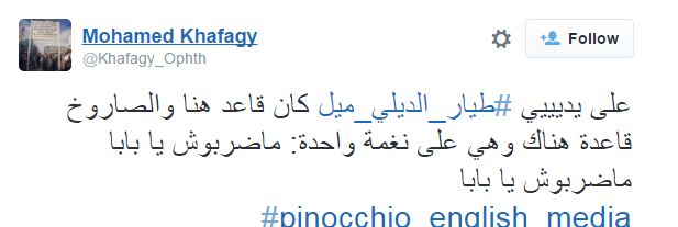 كما سخر Mohamed Khafagy قائلاً: “على يديييي #طيار_الديلي_ميل كان قاعد هنا والصاروخ قاعدة هناك وهي على نغمة واحدة: ماضربوش يا بابا ماضربوش يا بابا”.