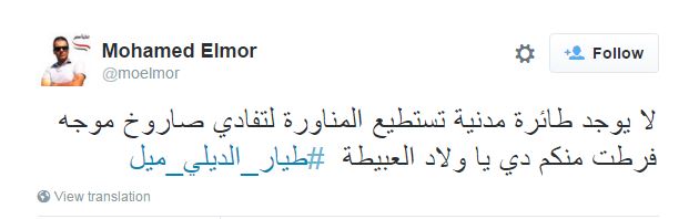 وسجل هاشتاج #طيار_الديلي_ميل قائمة الأعلى تداولاً على “تويتر”، نشر المغردون خلاله الكثير من التعليقات الساخرة، يقولMohamed Elmor“لا يوجد طائرة مدنية تستطيع المناورة لتفادي صاروخ موجه، فرطت منكم دي يا ولاد العبيطة”.