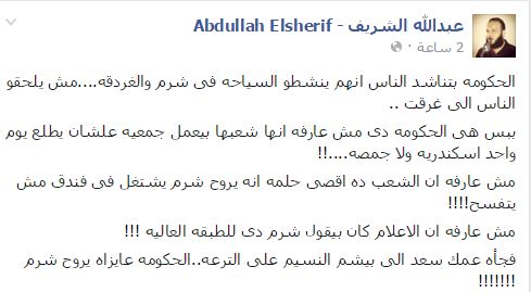 أعرب الشاعر عبدالله الشريف، عن دهشته من مناشدة الحكومة للمصريين بتنشيط السياحة الداخلية في شرم الشيخ والغردقة، عقب تداعيات حادث الطائرة الروسية، في الوقت الذي يغرق فيه مواطنون جراء الأمطار.