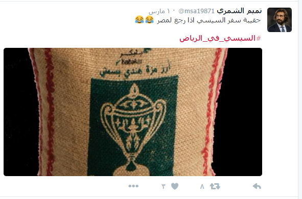 وسخر تميم الشمري فعرض صورة لجوال من الأرز وعلق على الصورة قائلًا: “حقيبة سفر السيسي إذا رجع لمصر”.