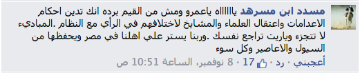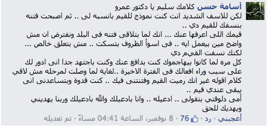 وذكر حساب آخر على فيس بوك: “ياه ياعمرو ومش من القيم برده انك تدين احكام الاعدامات واعتقال العلماء والمشايخ لاختلافهم في الرأي مع النظام .المباديء لا تتجزء ويا ريت تراجع نفسك .وربنا يستر علي اهلنا في مصر ويحفظها من السيول والاعاصير وكل سوء”.