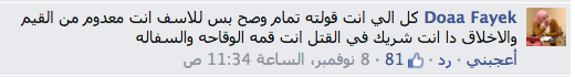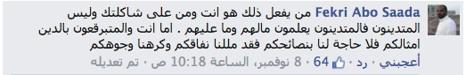 بينما قال فكري أبو سعدة: “من يفعل ذلك هو انت ومن على شاكلتك وليس المتدينون فالمتدينون يعلمون ما لهم وما عليهم.. أما أنت والمتبرقعون بالدين أمثالكم فلا حاجة لنا بنصائحكم فقد مللنا نفاقكم وكرهنا وجوهكم”.