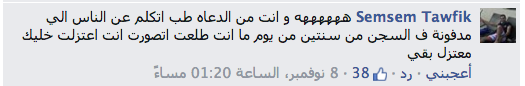 وقال حساب “سمسم توفيق” على فيس بوك: “أنت من الدعاه طب اتكلم عن الناس الي مدفونة ف السجن من سنتين من يوم ما انت طلعت اتصورت انت اعتزلت خليك معتزل بقى”.