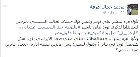 قال الكاتب الصحفي محمد جمال عرفة، “لأول مرة تنتشر على “تويتر” و”فيس بوك” حملات تطالب السيسي بالرحيل استعدادًا لذكرى ثورة يناير، باسم #‏مليونية_ضد_السيسي_عشان، و‫#‏ارحل_يا_فاشل و‫#‏كبيره_عليك و‫#‏انقذوا_مصر”.