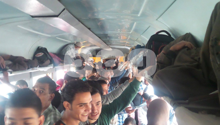 يلجأ بعض الركاب إلى حجز أماكنهم بين فواصل عربات القطار وخارجه وبفتحات النوافذ، الأمر الذي يشكل خطورة على حياتهم، بل وتحولت حوامل الحقائب إلى مقاعد ومكان للنوم للهاربين من الزحام.