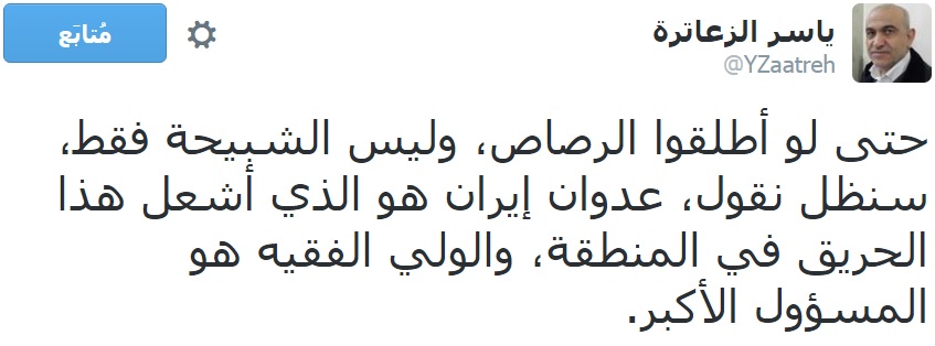 وقال “الزعاترة” في تغريدة له عبر حسابه الشخصي على موقع التواصل الاجتماعي “تويتر”: “حتى لو أطلقوا الرصاص، وليس الشبيحة فقط، سنظل نقول عدوان إيران هو الذي أشعل هذا الحريق في المنطقة، والولي الفقيه هو المسؤول الأكبر”.