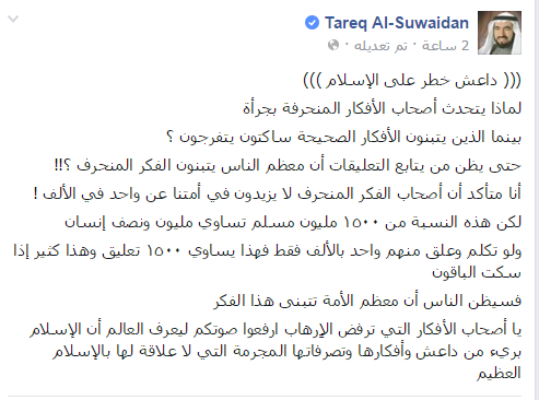 واستدرك قائلًا: “لكن هذه النسبة من ١٥٠٠ مليون مسلم تساوي مليونًا ونصف المليون إنسان، ولو تكلم وعلق منهم واحد بالألف فقط فهذا يساوي ١٥٠٠ تعليق وهذا كثير إذا سكت الباقون فسيظن الناس أن معظم الأمة تتبنى هذا الفكر”.