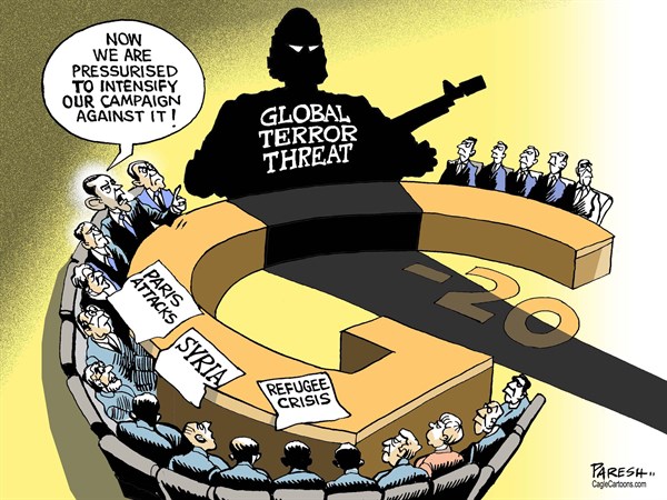 فنجد أن موقع “بولتيكال كارتونز” نشر هذا الرسم عن انعقاد قمة مجموعة العشرين والأحداث الإرهابية التي تحدث في العالم: