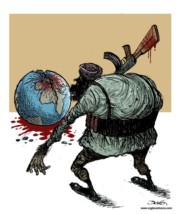أما موقع “كاجل” فعبر عن الدمار الذي سببه الإرهاب للعالم بهذا الرسم: