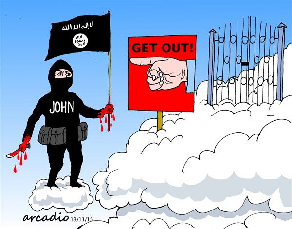 وقدم موقع “كاجل” رسما للملثم جون، ممثلا عن داعش وهو مطرود من رحمة الرب!